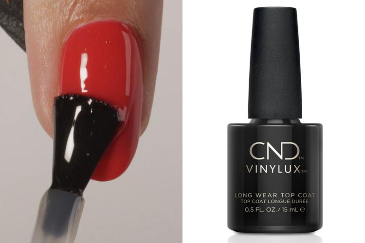 4. lépés: Száradás után, vigyél fel egy vékony réteget a CND Vinylux Top Coat fedőlakkból, majd hagyd 8 és fél percig száradni. A fedőlakkot ne rázd fel és figyelj rá, hogy a körmöd teljes felületére vidd fel a körömlakkot és ne hagyd ki a szabadszéleket (azaz a körömvéget) sem. |